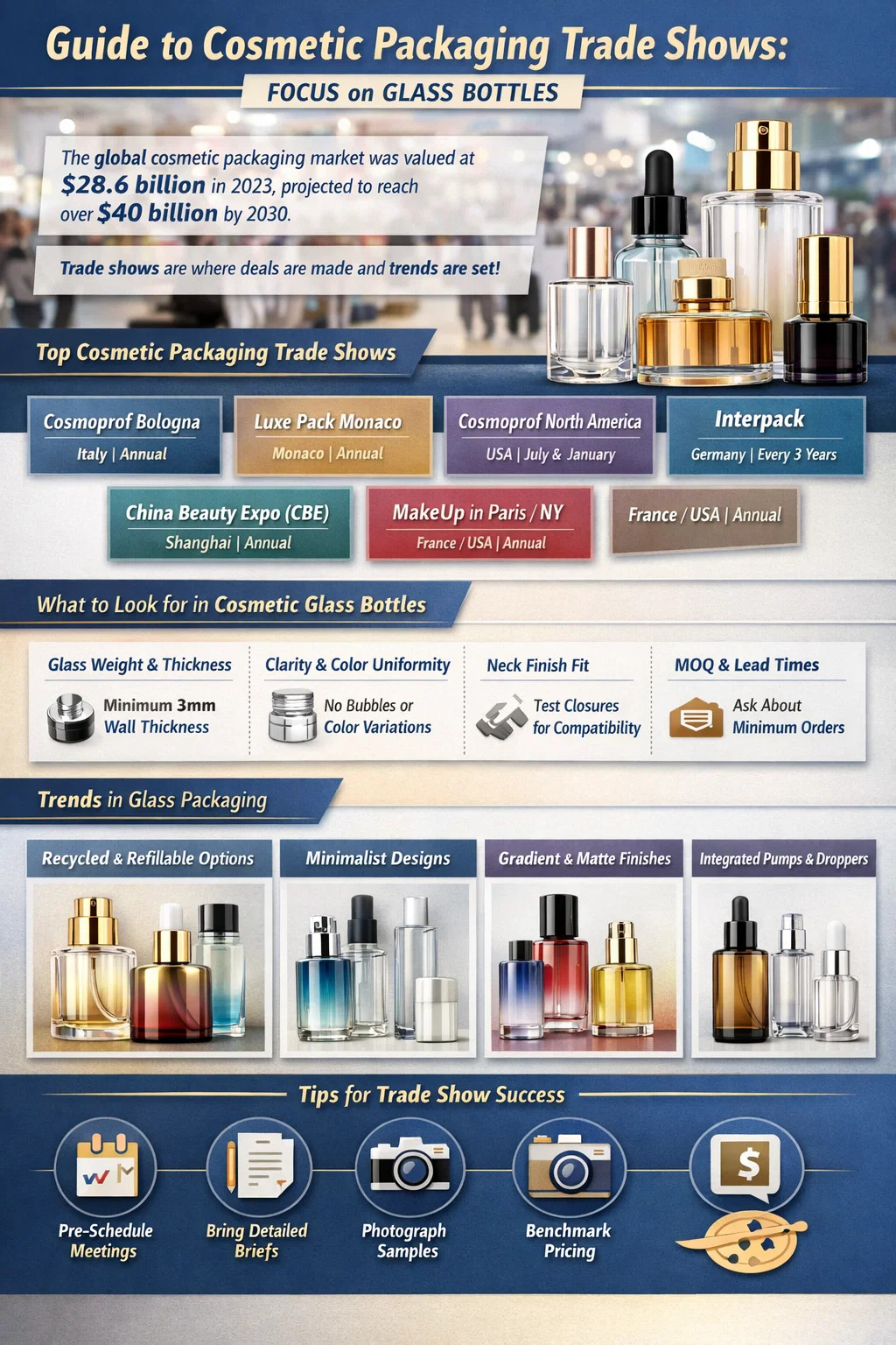 If you are sourcing packaging for cosmetic products — especially premium materials like cosmetic glass bottles — attending the right trade shows is one of the most efficient decisions you can make. In a single venue, you can compare hundreds of suppliers, handle physical samples, negotiate pricing directly, and build relationships that take months to replicate through email outreach. The global cosmetic packaging market was valued at approximately $28.6 billion in 2023 and is projected to reach over $40 billion by 2030, according to Grand View Research. Trade shows are where a significant portion of this market is shaped — deals are made, trends are set, and supplier networks are built.
