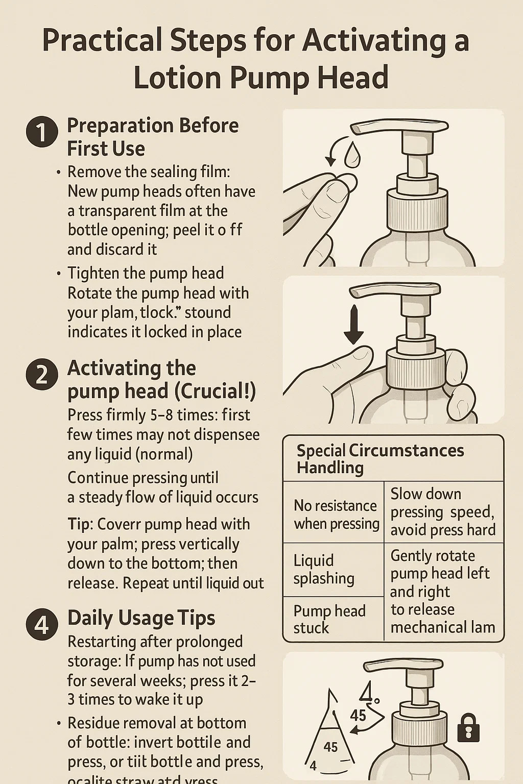 Remove the sealing film: New pump heads often have a transparent film at the bottle opening; peel it off and discard it (some may require puncturing with a needle).
