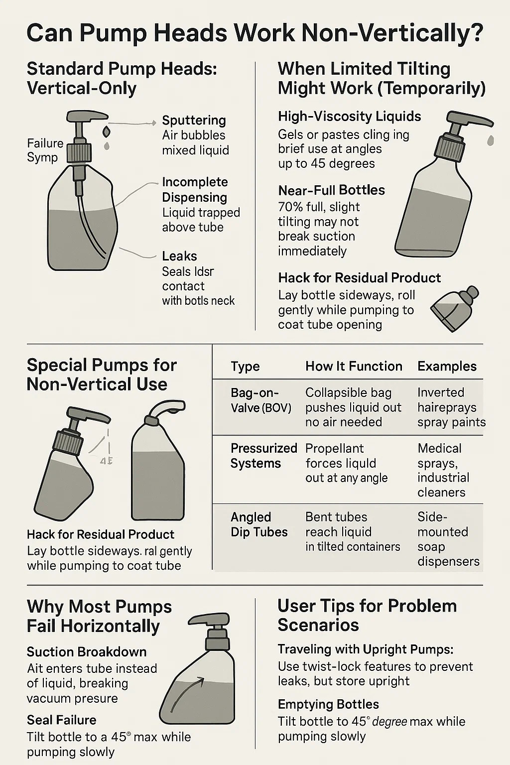 Gravity-Dependent Design: Dipependent Design: Dip tubes require liquid to pool at the bottle’s bottom. Tilting interrupts suction, causing air intake or dry pumping.