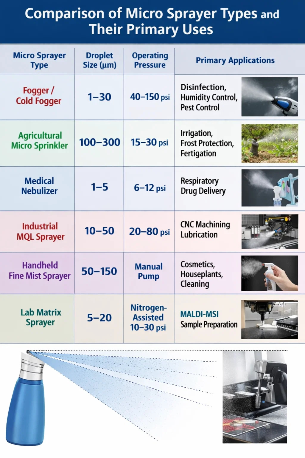 | Micro Sprayer Type | Droplet Size (µm) | Operating Pressure | Primary Applications |