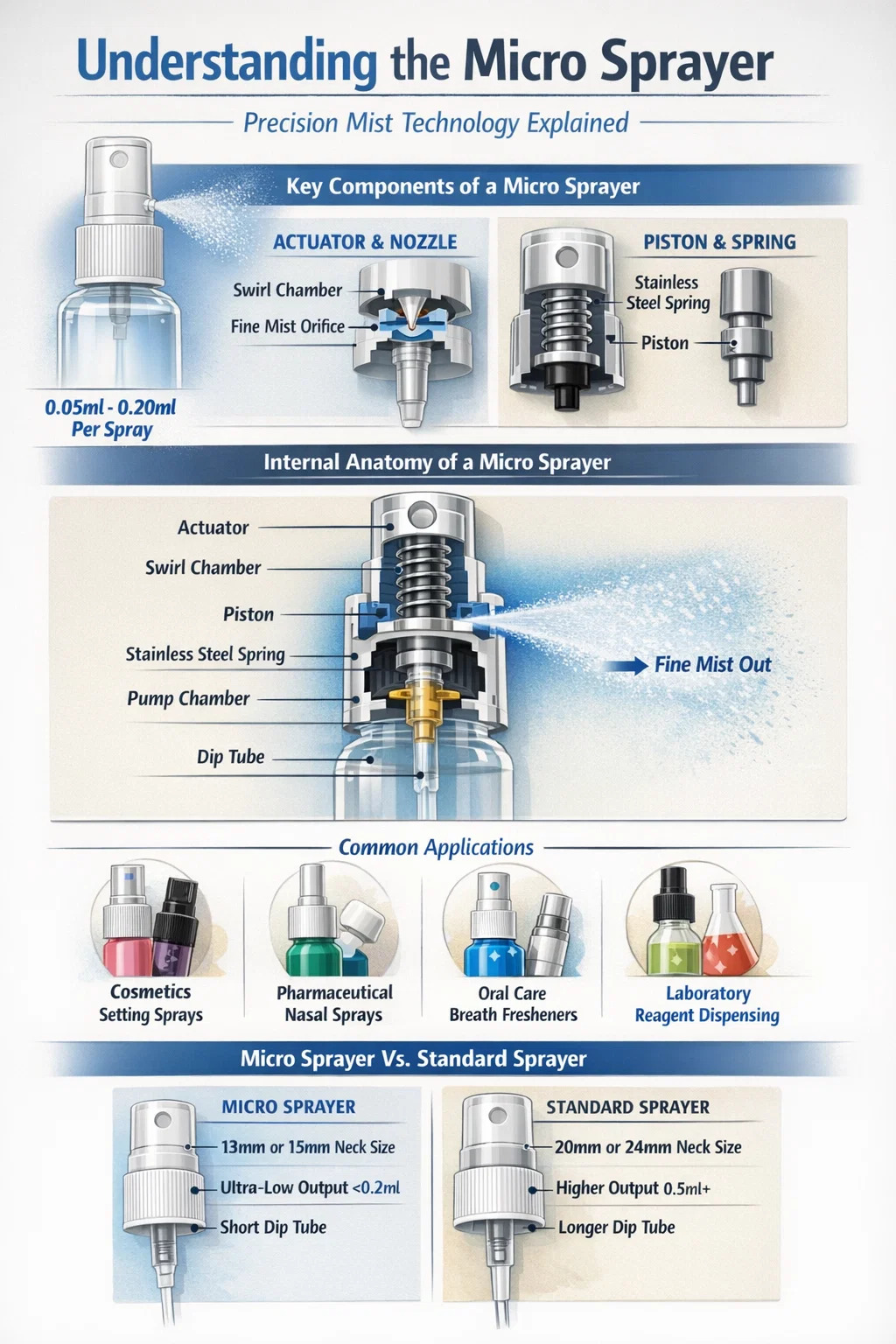 To answer the question "What is a micro sprayer?", it is a precision-engineered dispensing device designed to convert liquid into an extremely fine, consistent mist with a very low output volume per stroke. Unlike standard trigger sprayers used for household cleaning, a micro sprayer typically dispenses between 0.05ml and 0.20ml of product at a time, making it the ideal choice for high-value liquids where dosage control and delicate application are paramount.