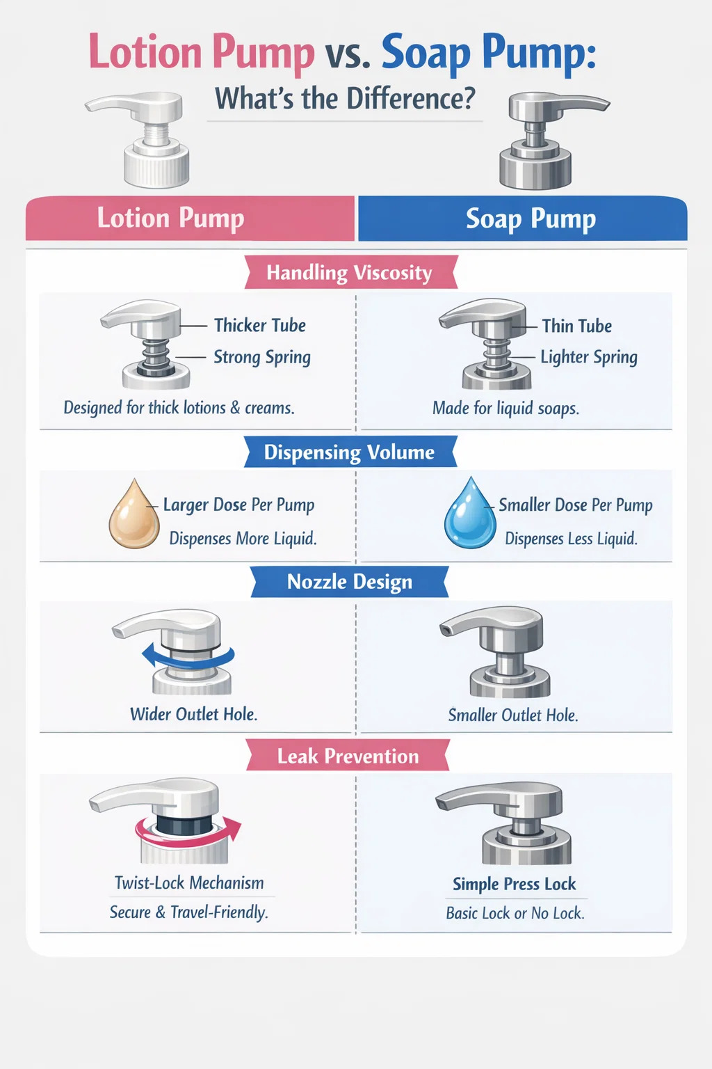 Although lotion pumps and soap pumps look very similar and are often used interchangeably, they have significant differences in their internal design and functionality.